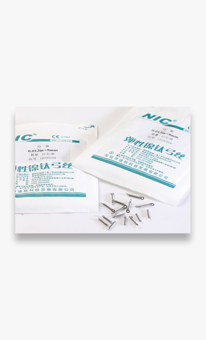 耳環拉簧 耳環拉簧是在彈簧體的兩端分別安裝耳環式的片狀掛鉤,便于牙醫置放和摘除拉簧,有多種形態的耳環拉簧組合。