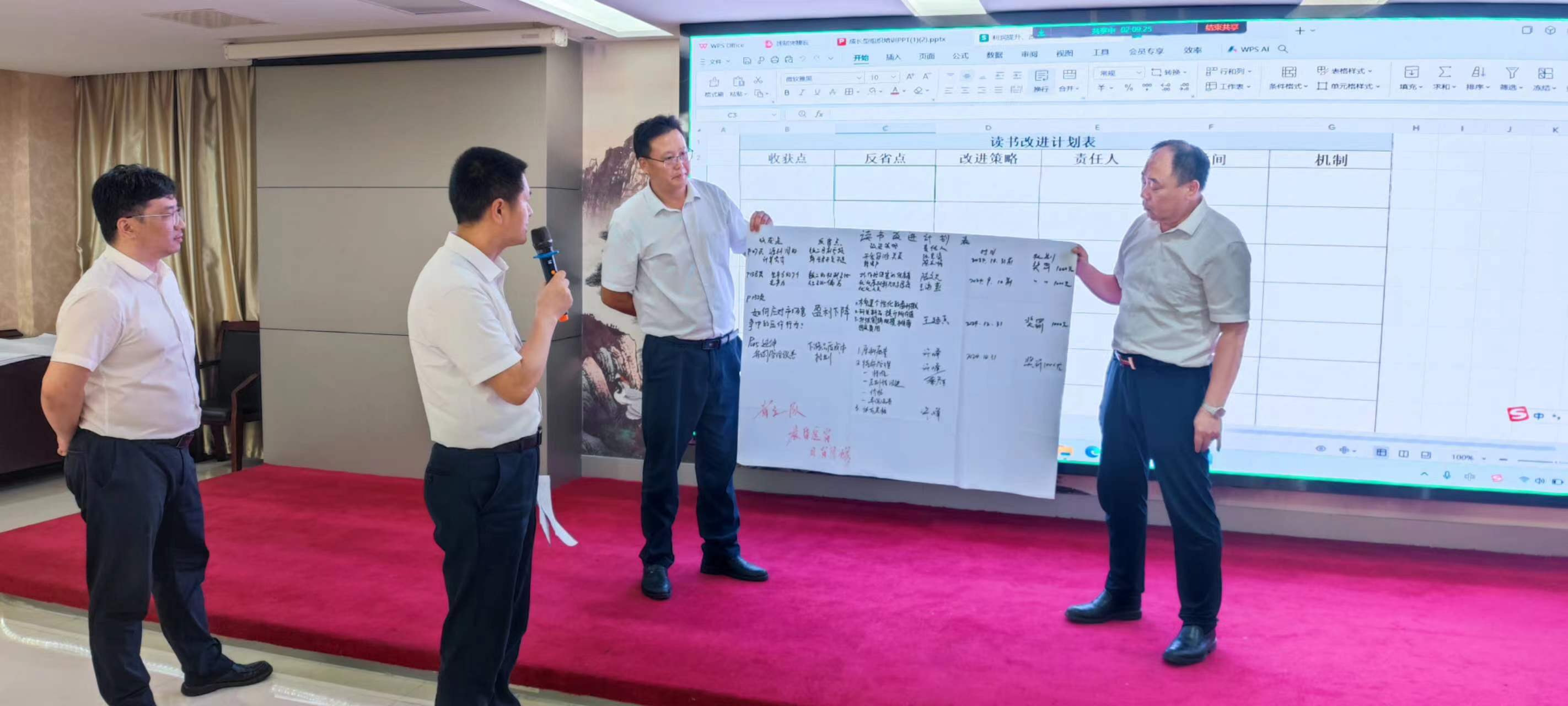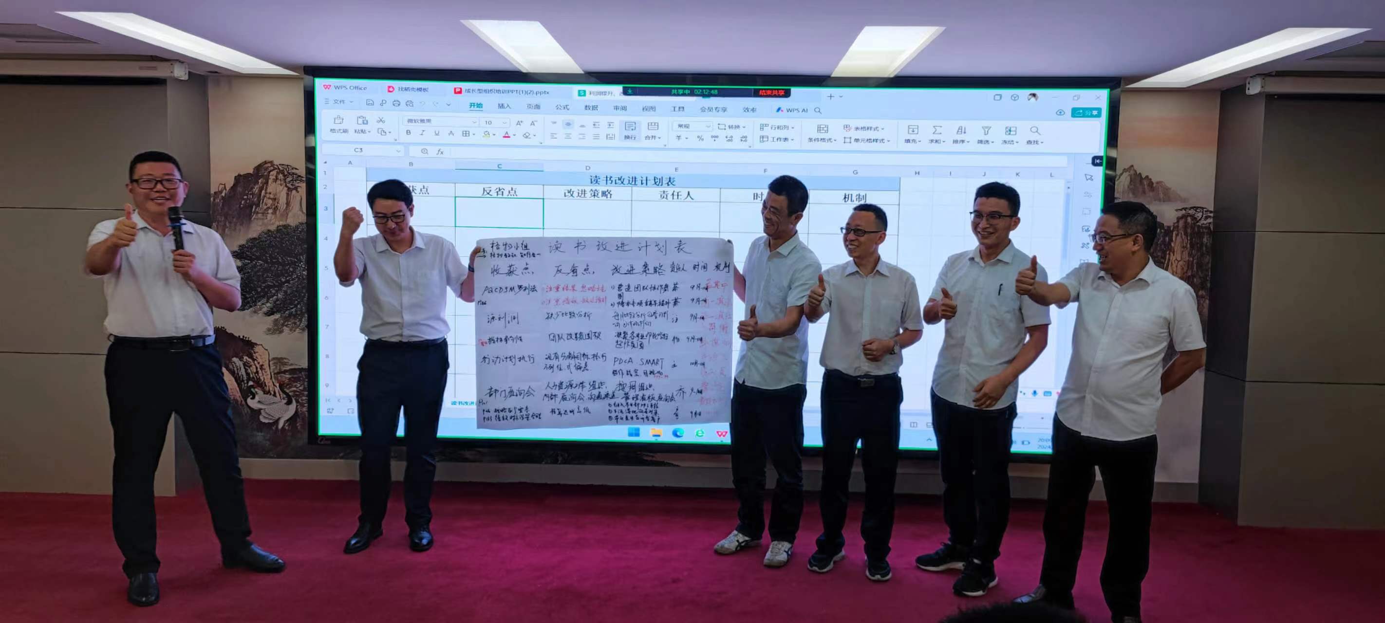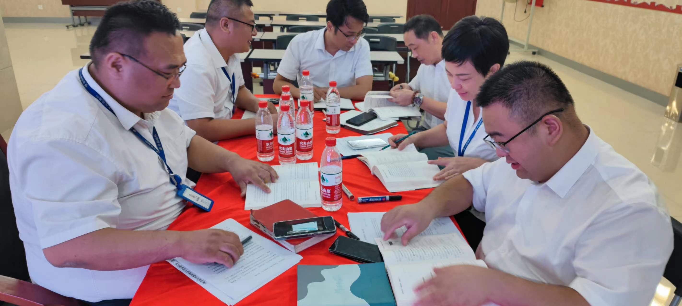 在交流環(huán)節(jié),每個小組組長分別上臺發(fā)表感言,所思、所想、所悟,并聯(lián)系實(shí)際工作中的不足與欠缺之處,以及有待解決或尚未發(fā)現(xiàn)的問題,大家暢所欲言,無不盡抒。每個小組根據(jù)收獲點(diǎn)、反省點(diǎn)、改進(jìn)策略、責(zé)任人、時間、機(jī)制相關(guān)內(nèi)容完成了本次學(xué)習(xí)的《讀書改進(jìn)計(jì)劃表》,并上臺宣讀、講解、公示。