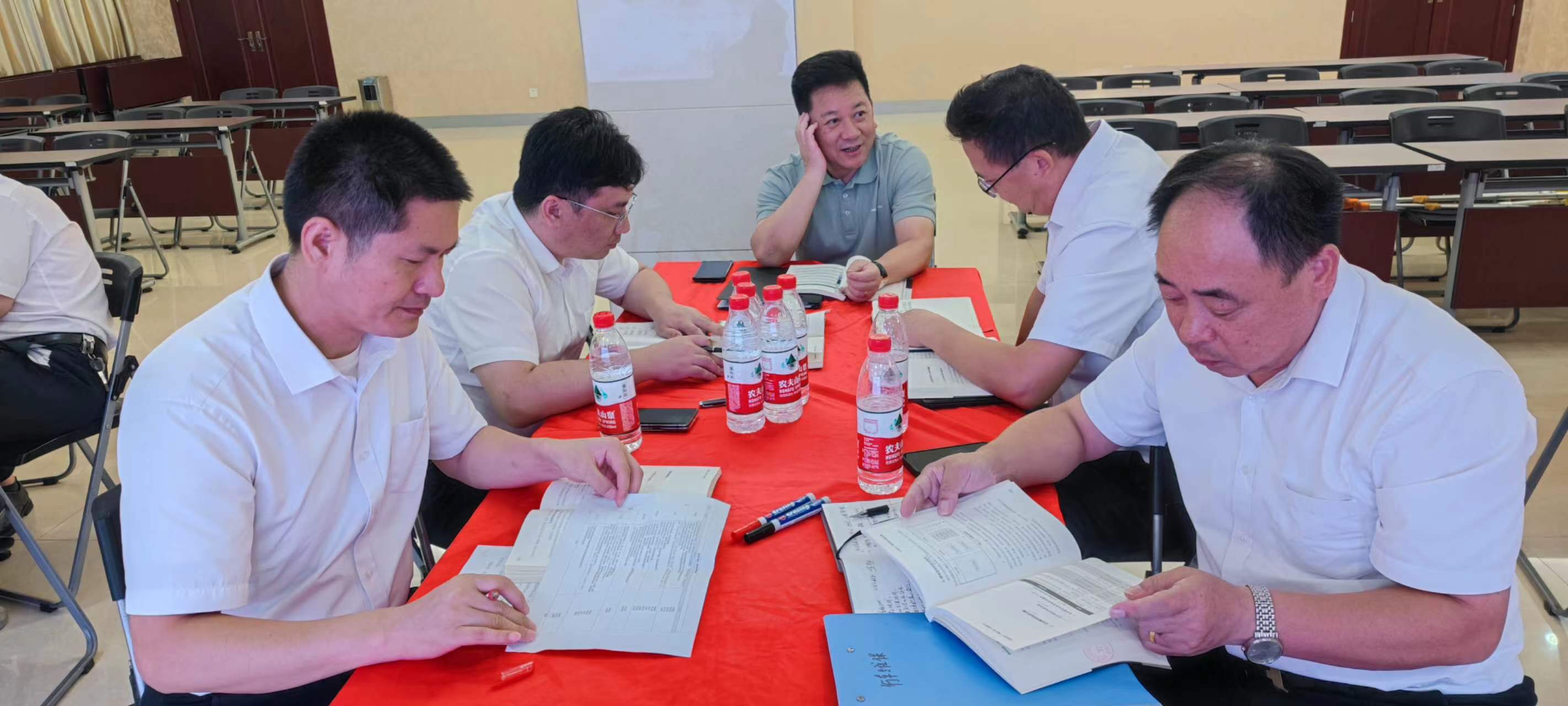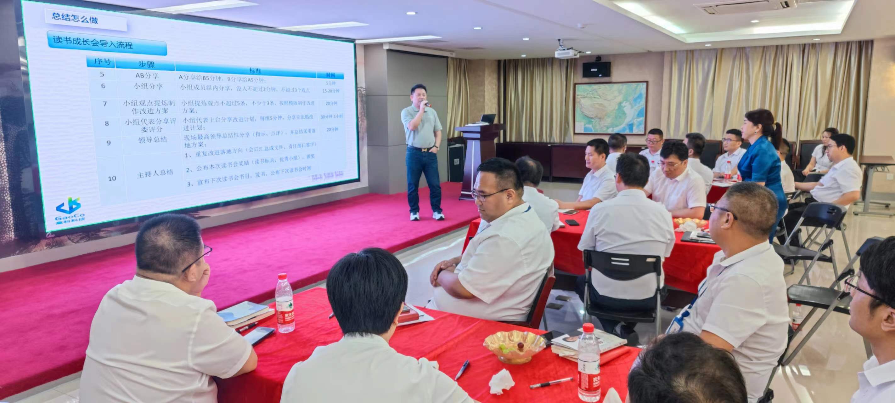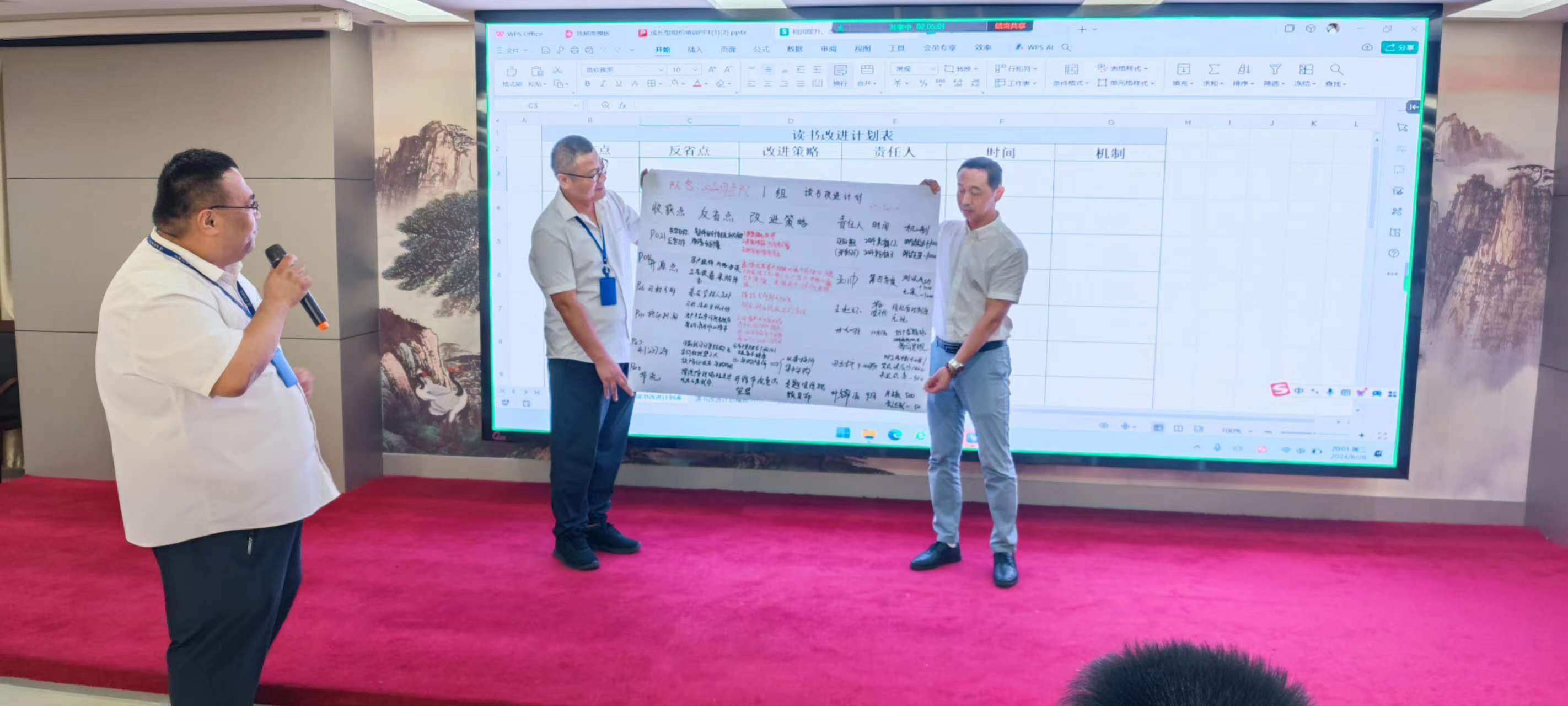 在交流環(huán)節(jié),每個小組組長分別上臺發(fā)表感言,所思、所想、所悟,并聯(lián)系實(shí)際工作中的不足與欠缺之處,以及有待解決或尚未發(fā)現(xiàn)的問題,大家暢所欲言,無不盡抒。每個小組根據(jù)收獲點(diǎn)、反省點(diǎn)、改進(jìn)策略、責(zé)任人、時間、機(jī)制相關(guān)內(nèi)容完成了本次學(xué)習(xí)的《讀書改進(jìn)計(jì)劃表》,并上臺宣讀、講解、公示。