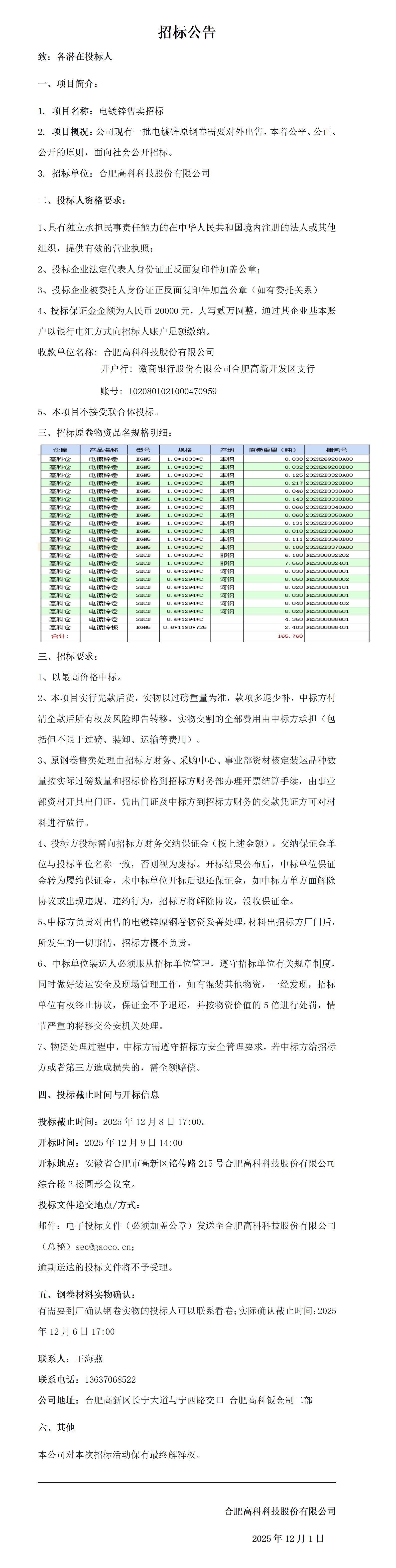 合肥高科電鍍鋅售賣招標公告.docx