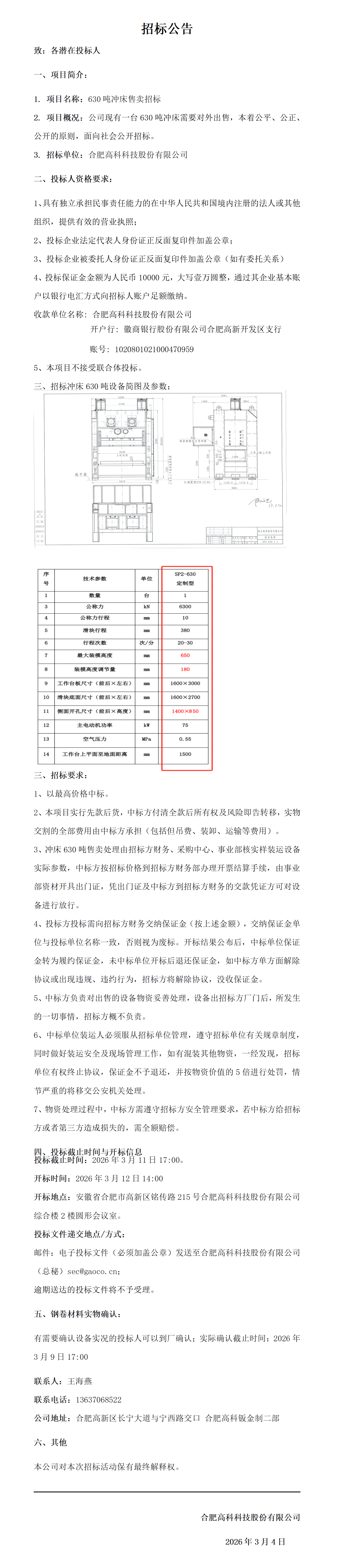 合肥高科B01沖床630噸銷售招標公告.docx