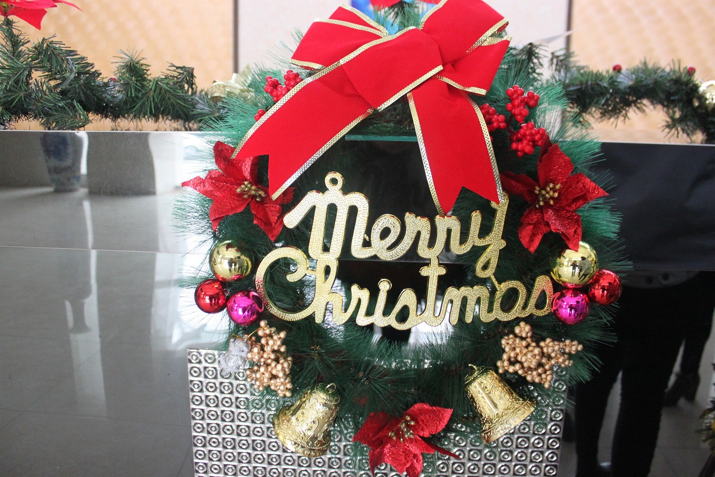 活動(dòng)現(xiàn)場(chǎng)設(shè)在行政大廳,經(jīng)過大家的努力,把大廳布置的非常漂亮,但前期的工作還是相當(dāng)大的,寫賀卡、組裝圣誕樹等,還搭配許多裝飾。
